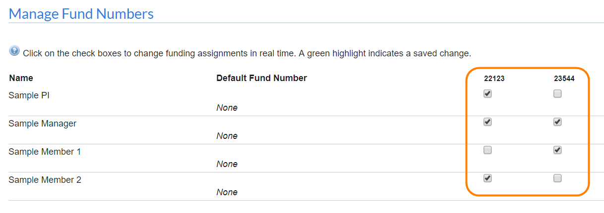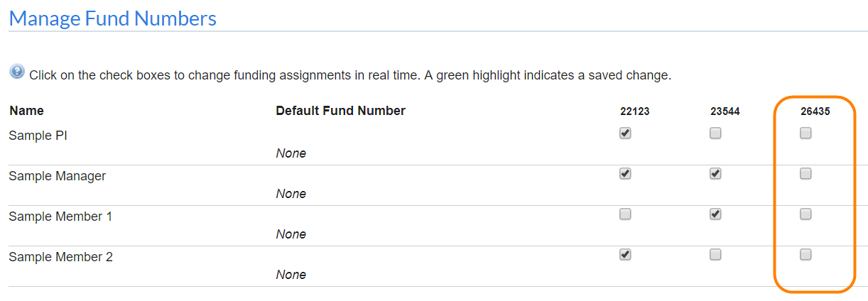 Adding or removing fund numbers for each of the lab members can be done in the Manage Fund Numbers section of the tab. To assign a fund number to a user, click the check box of the fund number in the row of the user you wish to assign to. To remove a fund number, click on the check box to remove the check.