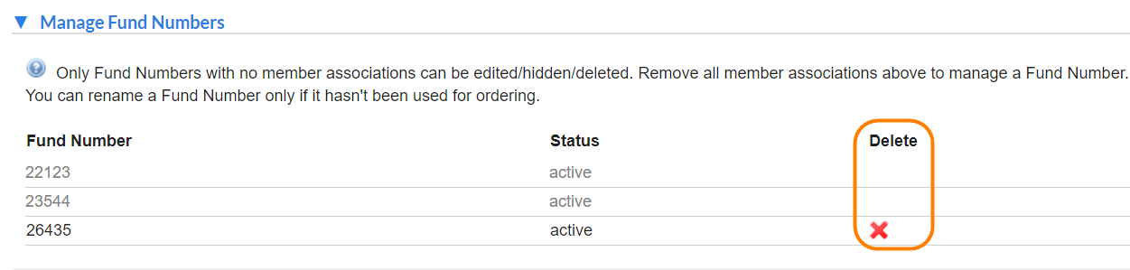 There may be times when a valid fund number should no longer be used. Certain institutions allow for a fund number to be deleted and other institutions allow only for a fund number to be disabled. Note that only fund numbers without current charges associated with them can be hidden or deleted.