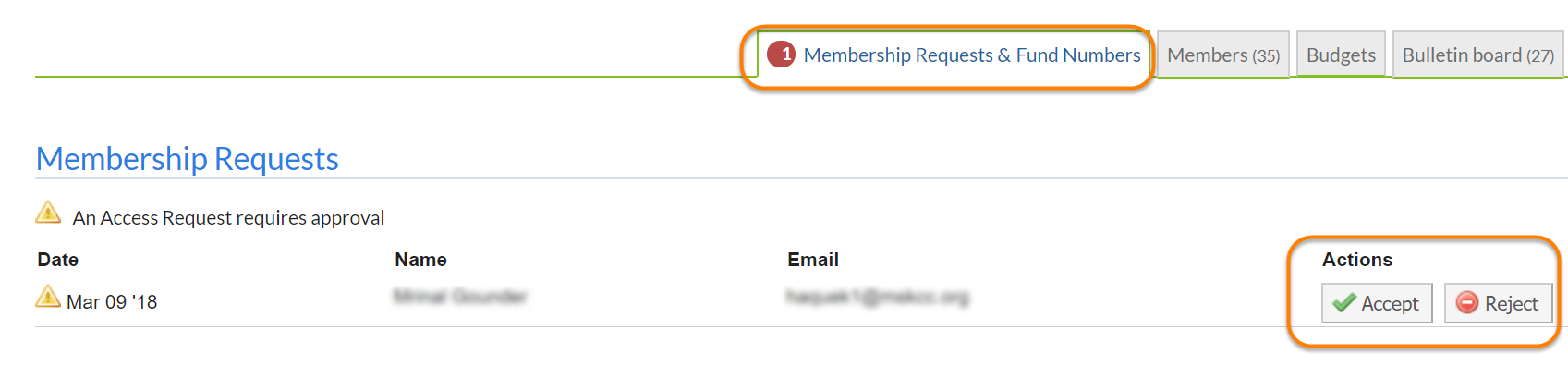 You can choose to 'Accept' or 'Reject' the membership request. If accepted, the user will be added to your group/lab. You will then be able to assign funding to your user.
