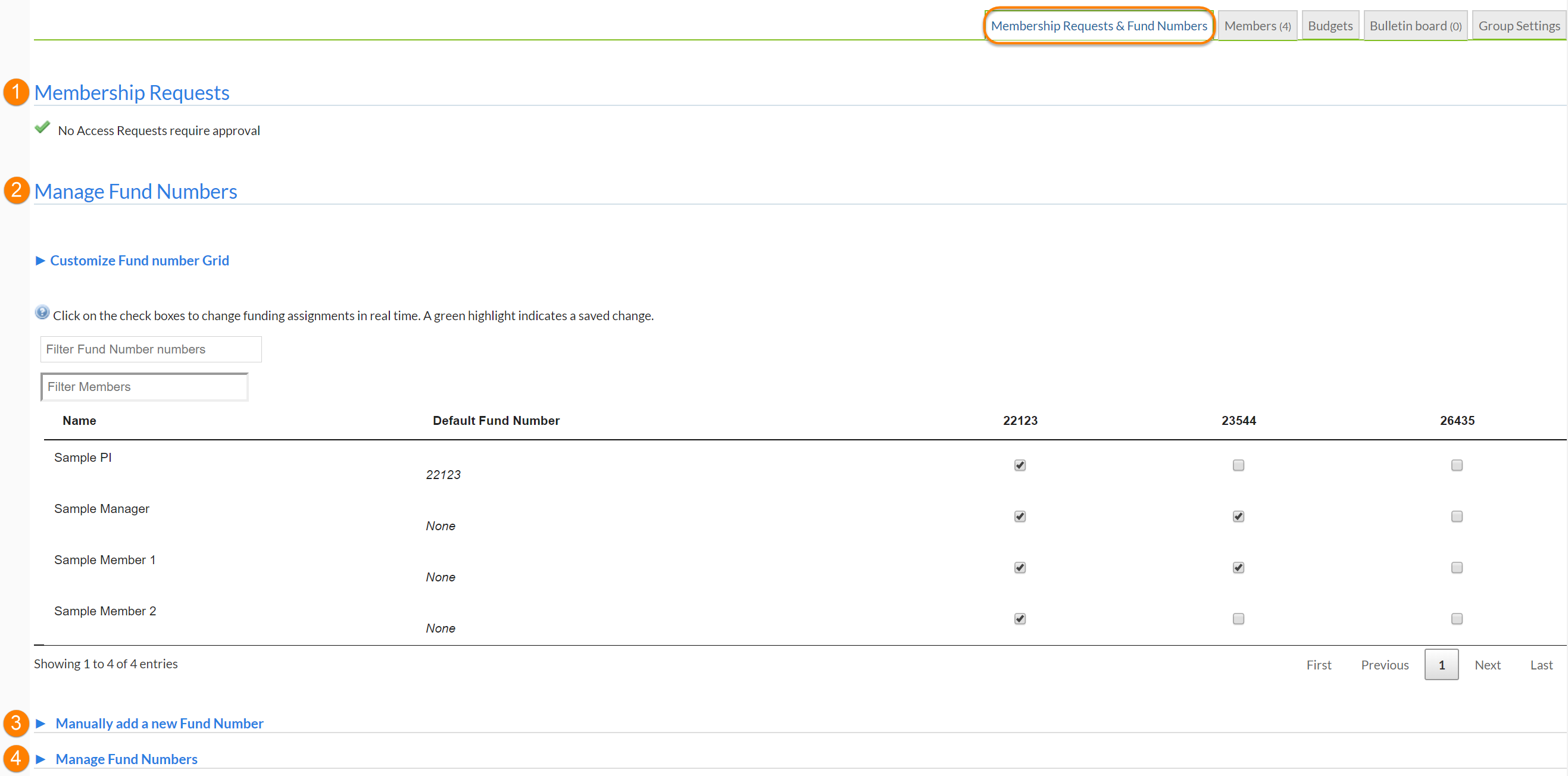 The Membership Requests & Fund Numbers tab provides tools for the PI or group manager to approve group memberships, manage access to funds and to request additional funds (if allowed by the institution).