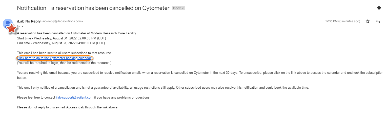 When a reservation is canceled, Core Customers who have enabled Cancellation Notifications for a specific calendar will receive email notifications at their iLab email address. This makes it convenient for Core Customers to view and potentially book the available time slot.