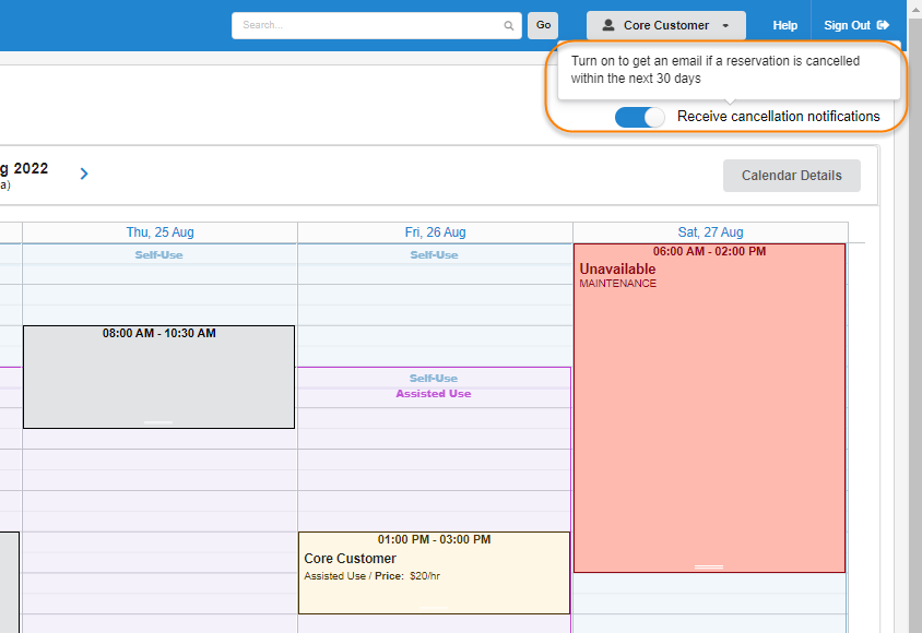 Core Customers must toggle the switch for this setting on each calendar's View Schedule interface to enable Cancellation Notifications. By turning it on, they will subscribe to email alerts when other Core Customers cancel their scheduled reservations.