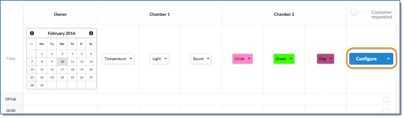 On the configuration view, click the day you wish to configure. Check the times of day that must be configured by clicking the check boxes. Then, select the attribute(s) that must be configured for that time. Finally, press the "Configure" button once the attributes and times are selected.