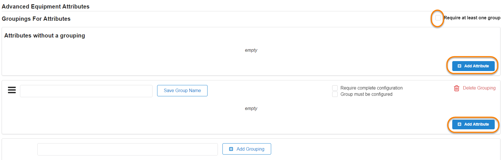 If you do not have one, start with your first grouping by typing a name and pressing the "Add grouping" button. If you want to require at least one grouping to be selected by users, click the "Require at least one group" check box. To create attributes under each grouping, press the "Add attribute" button.