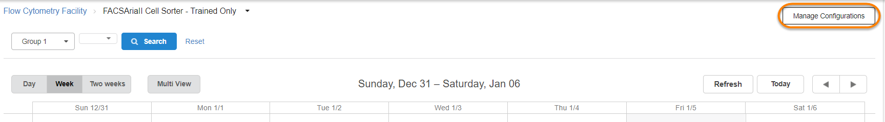 To configure the calendar based on a reservation, press the Manage Configuration button on the calendar page. Then click on the day of the reservation on the calendar.