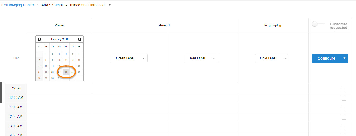 Go to the top. The configuration of the reservation displays at the top section. Check the boxes for the times that you wish to have that configuration. Press the "Configure" button.