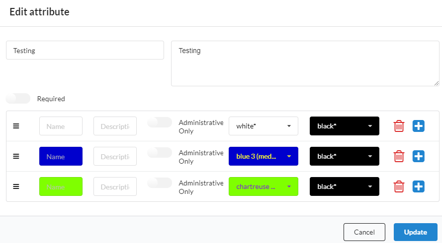 For each attribute, you must have a name, a description and at least one item to be selected. You can make selecting the attribute mandatory by toggling the "Required" switch to on. You can also make the attribute visible only to core staff by toggling on the "Administrative only" switch.