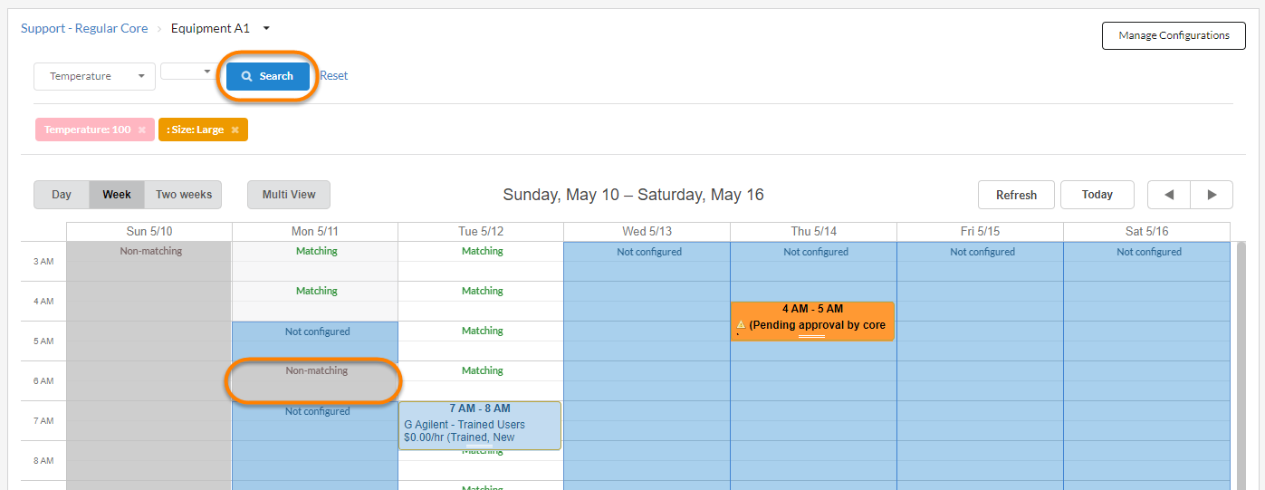Click the View Calendar button to go back to the calendar. On this page, to view when an attribute is configured, select an option from the drop down and then press "Search". You will see where your attribute matches, does not match, and where the calendar is open.