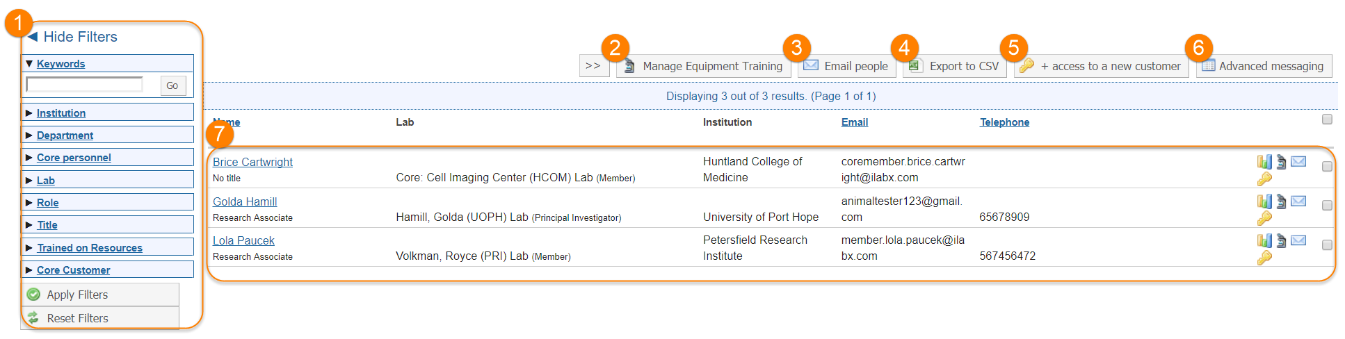 - Core Administrators: Find core customers and lab members. Access Request tools are available.