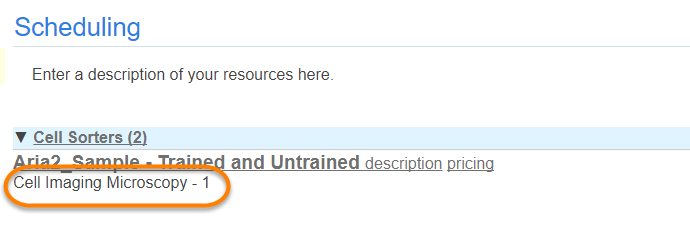 - Always show schedule description: Define field as YES if you would like to display a description for resources. If yes, the description will display as follows. If no, the description link can be clicked on and the description will display. Most groups display the description as it provides valuable information about the resource.