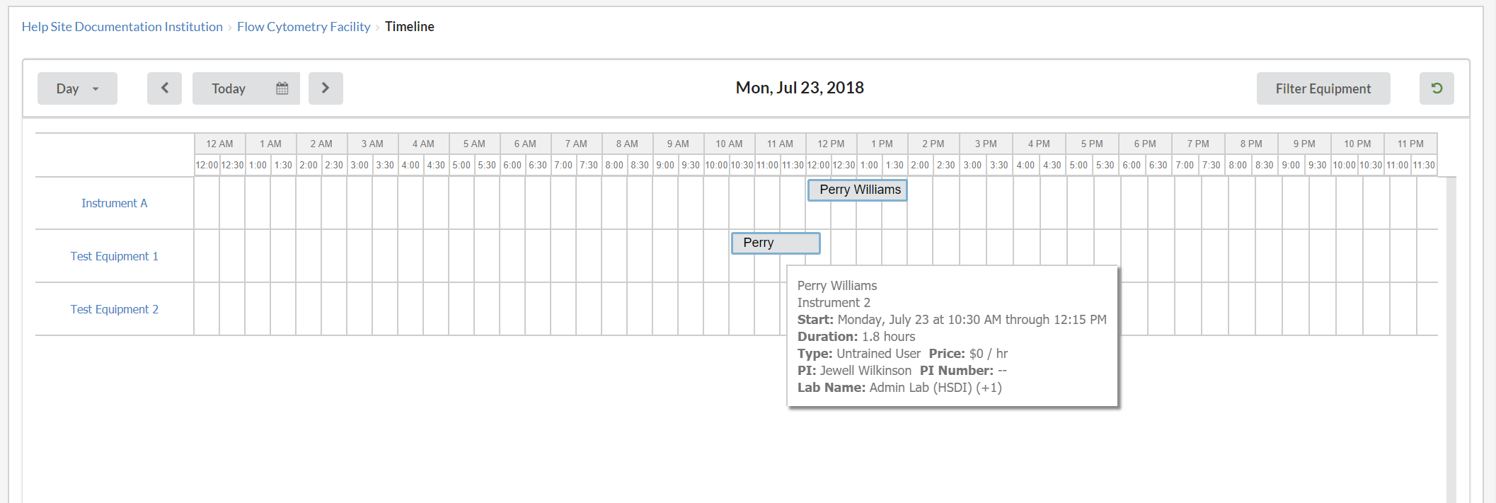 - Enable timeline view on equipment tab: Define as YES if you would like users to view a timeline of reservations on the equipment. Timeline view offers a small peek into all of the reservations on all pieces of equipment for one day or week in a horizontal view. Hovering over the reservation will show reservation details.