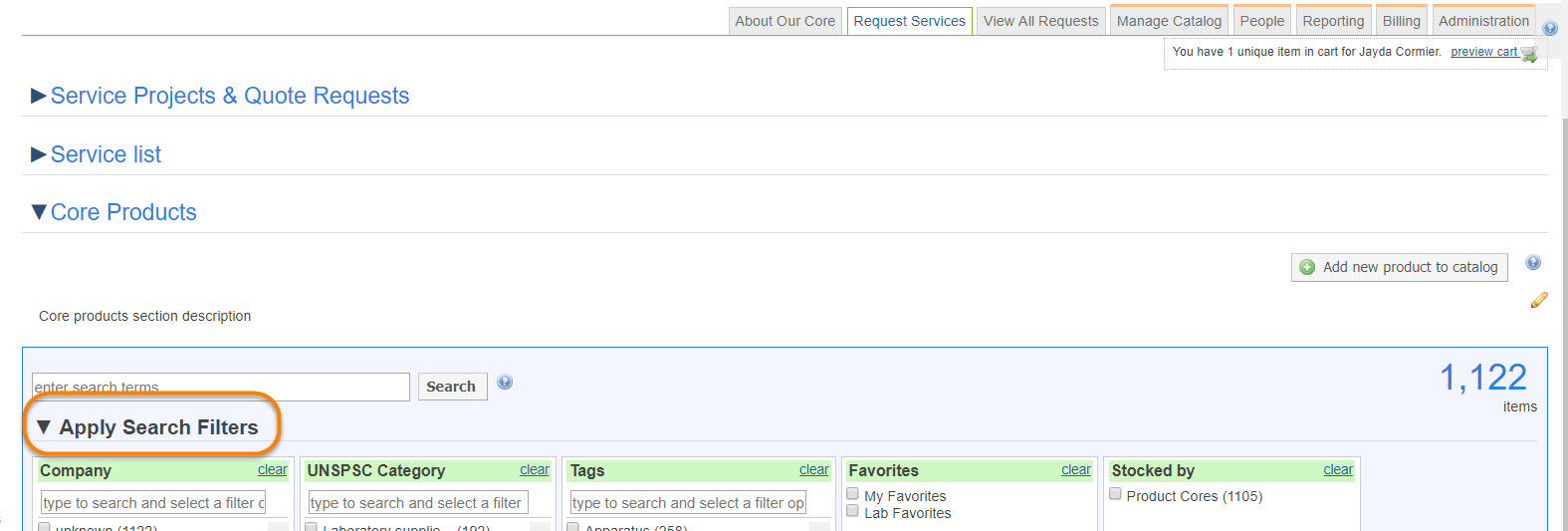 - Show product search on external iLab landing page: Define this field as YES if you would like to display the product search tool on the external core landing page.