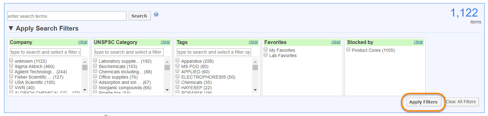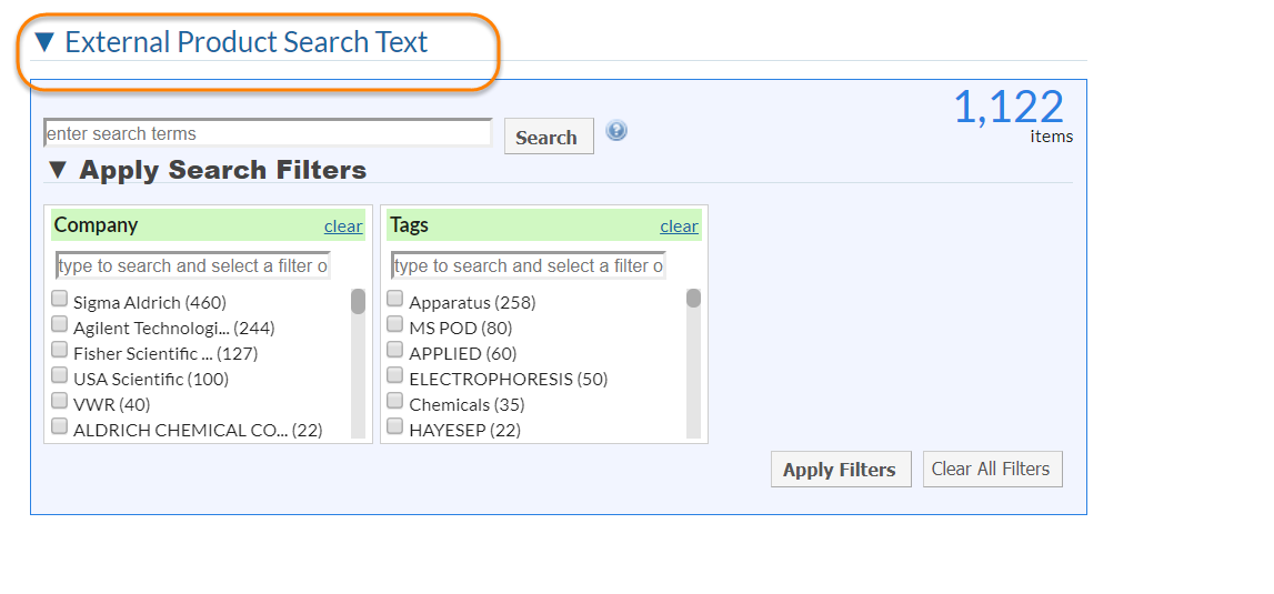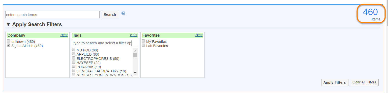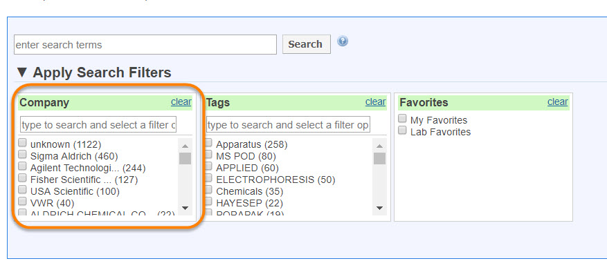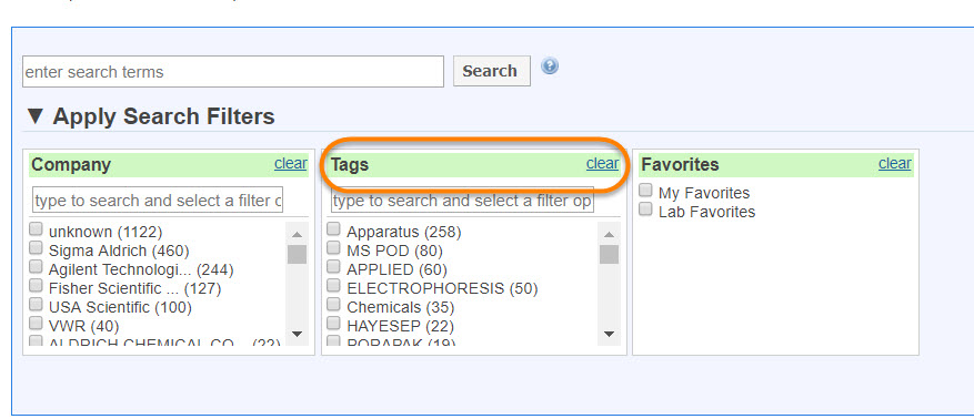 - Use the simple product search?: Define this field as YES if you would like to be able to use the simple search as an alternative to filter search. Simple search will only show the Company, Tags and Favorites fields shown in the screenshot below.