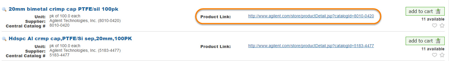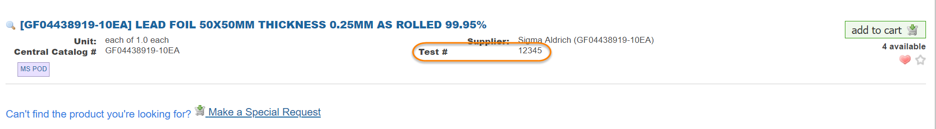 - Custom label for facility catalog number: A facility catalog number is an external catalog number that can be displayed for your product. This setting allows for the name to be customized. In this example, we named it "Test #". This will only show up if a facility catalog number is present within the product information.