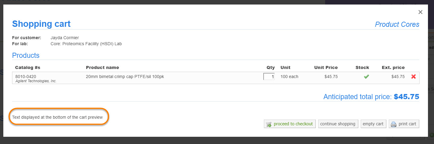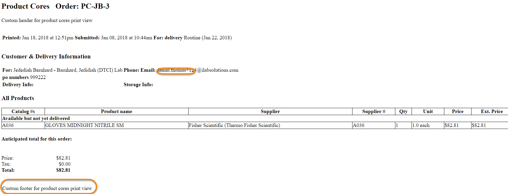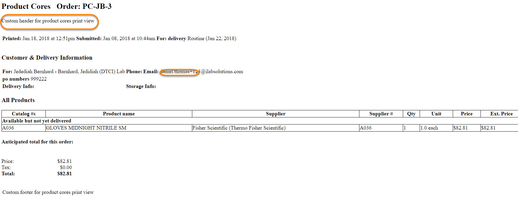 - Custom footer for product cores print view: Enter a custom footer for the print view.