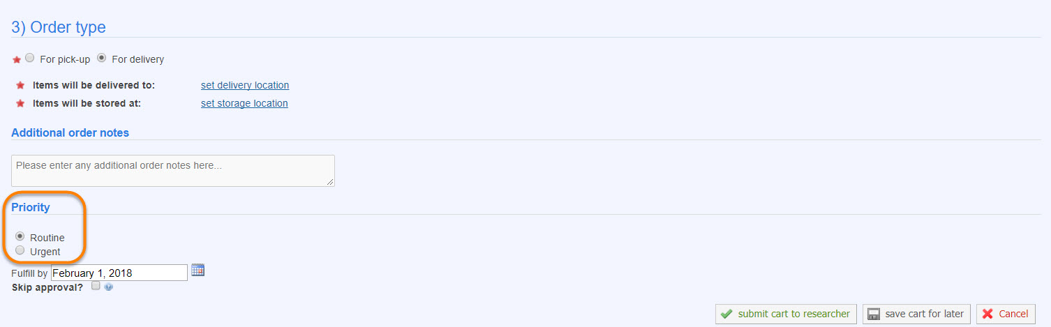 - Show institute delivery location on product order submissions: Define this field as YES if you would like to display preloaded institute wide delivery location on order submissions for a customer to select from.