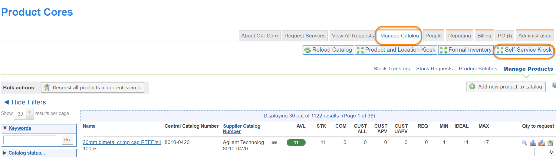 - Enable self-service kiosk: Define this field as YES and a button for the Self-service kiosk will show on the Manage Catalogs tab. This button allows core administrators to access the self-service kiosk. Core users can access the self-service kiosk via an iPad or computer in the facility where the products live.