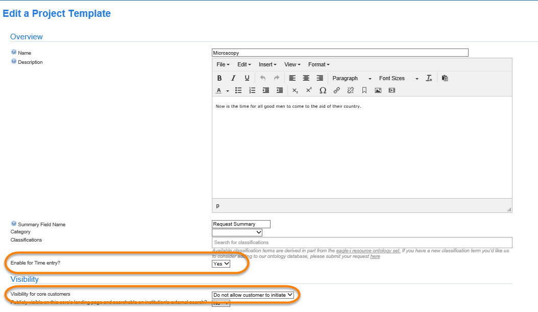 If adding a new template, give the project a name and description (optional) in the Overview section, as discussed in Editing the Service Requests panel. The setting to "Enable for Time Entry" must be changed to "Yes". In the Visibility section, you may also want to select "Do not allow customers to initiate" if core staff only should be able to initiate this request.