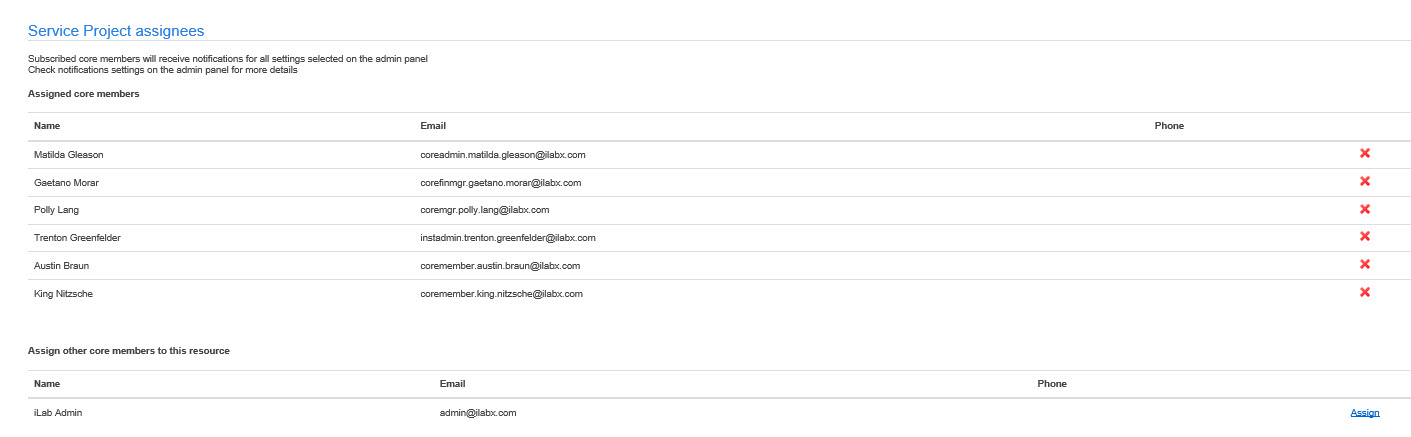 Next, in the Service Project assignees section you will see a list of core staff . Select the core staff that should be able to track their time against this type of project by clicking "Assign" to the right of their name. This will move them to the Assigned core members section. You can remove the assigned members using the red "X" to the far right.