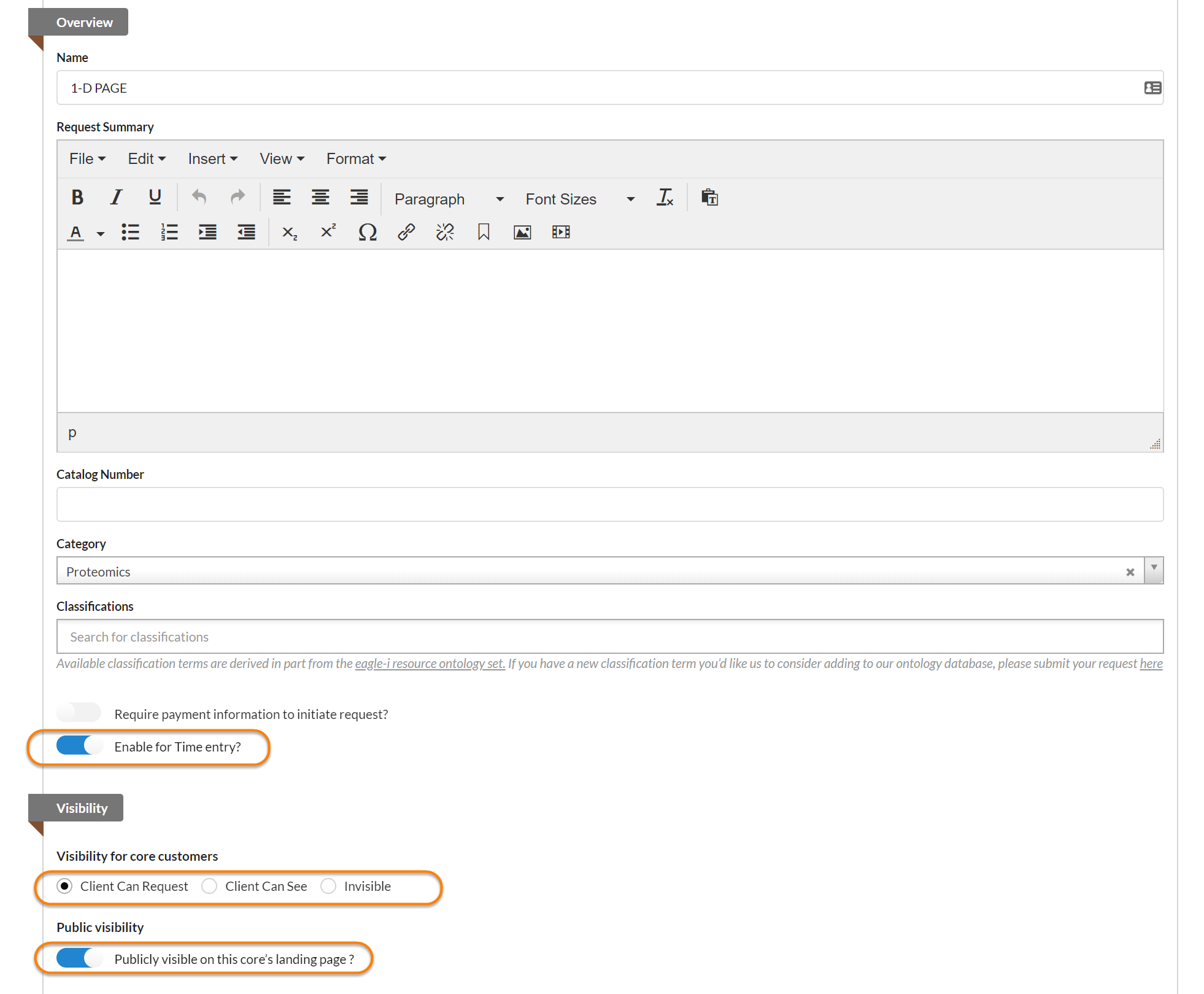 If adding a new service template, update the fields necessary to define the service (as discussed in Editing the Service Requests panel). Time Entry must be enabled in the Overview section. You may also want to limit the customer visibility of the service item in the Visibility section.