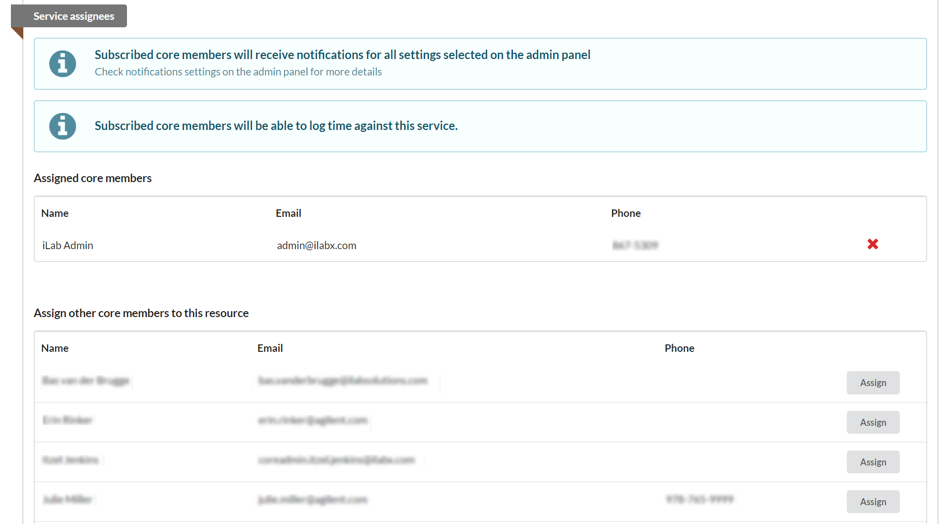 Next, in the Service assignees section you will see a list of core staff. Select the core staff that should be able to track their time against this type of project by clicking "Assign" to the right of their name. This will move them to the Assigned core members section. You can remove the assigned members using the red "X" to the far right.