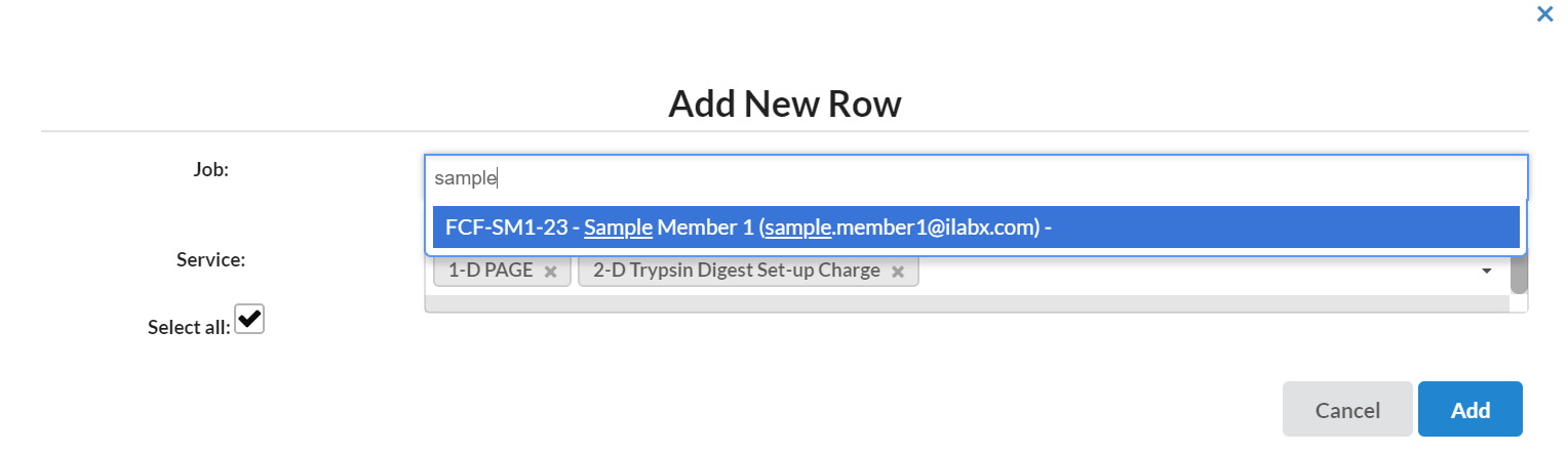 Available services that have been assigned to the selected core staff member will display. Delete any service items that do not apply to this project, or that you do not wish to track time against. Then, click "Add" to add the job to the time sheet. One row will be added for each service.