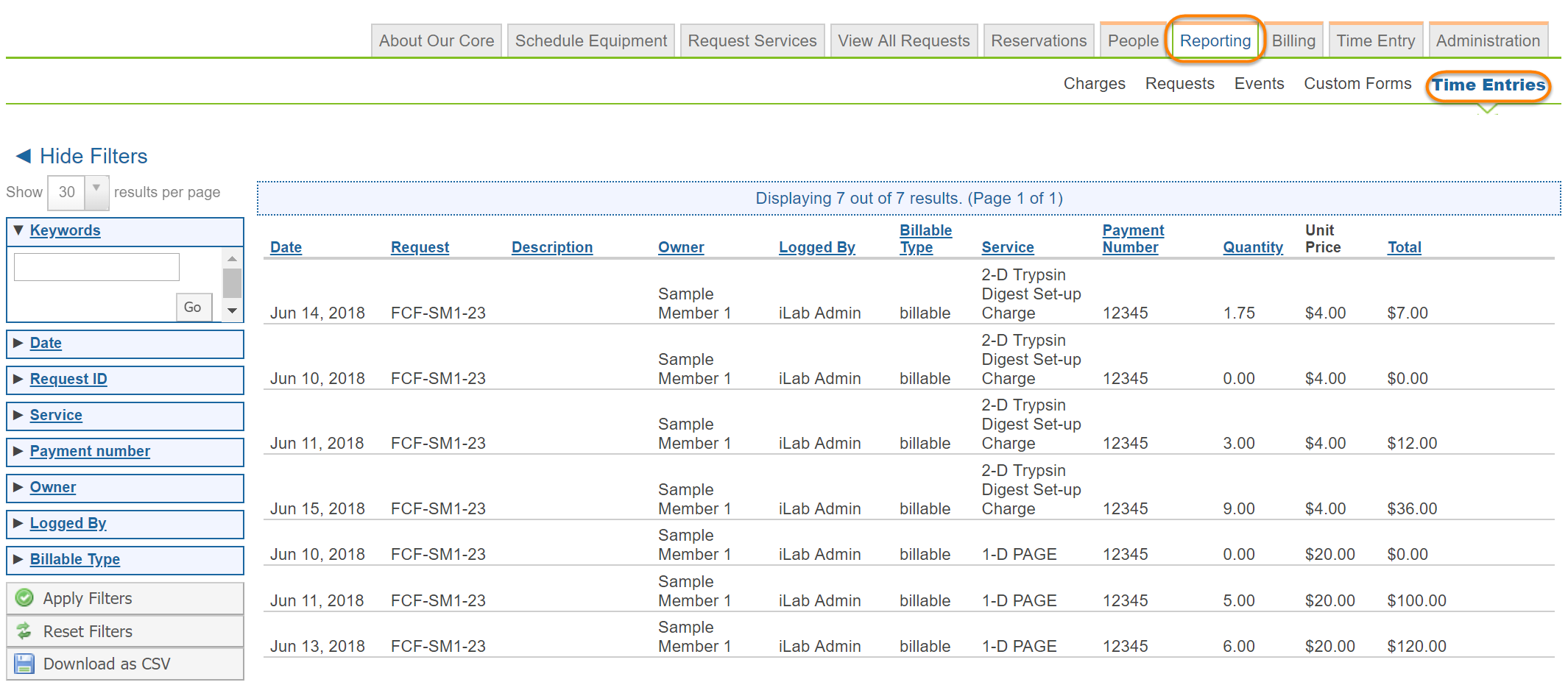 Core members can see the time sheet entries in the reporting interface. To do so, click on the Reporting tab and select the "Time Entries" sub-tab: