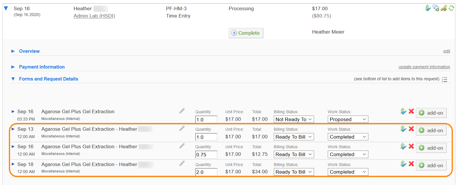 Because Time Entry is integrated into the Core Facility Management module, completed entries can be viewed on the corresponding Service Request on the View All Requests tab. Also, these entries will create charges that will populate in the New Billing Event interface.