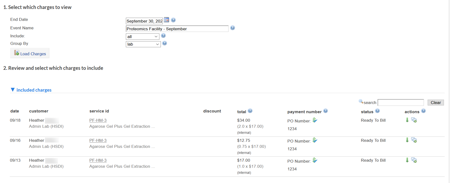 The filters on the left-hand side can be used to narrow down the selected charges, and the data can be exported to CSV using the "Download as CSV" button. For more general information on the reporting module, see Reporting.