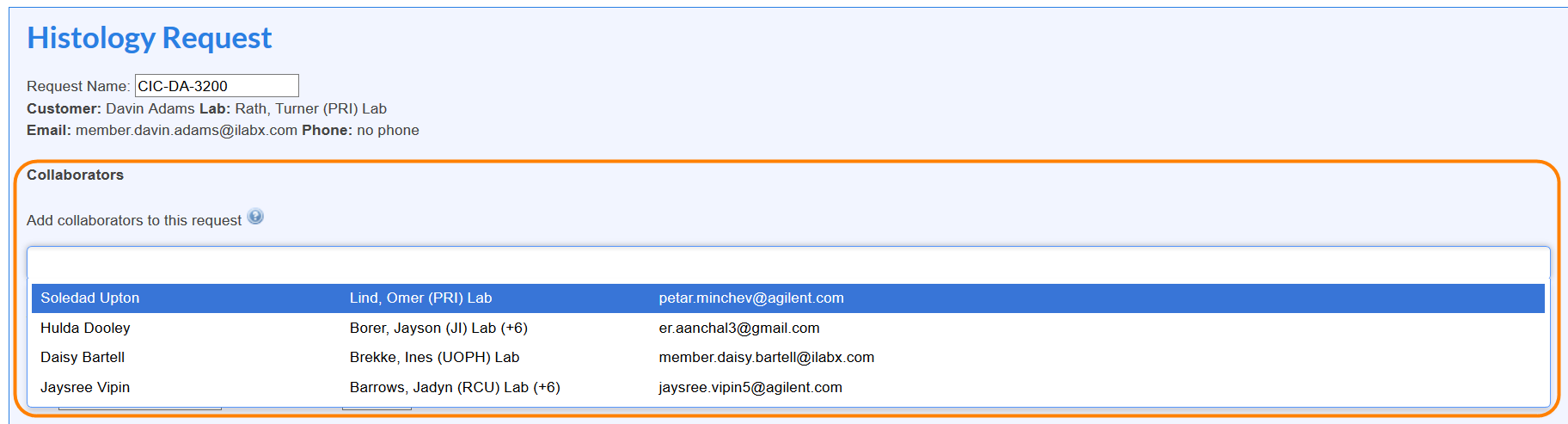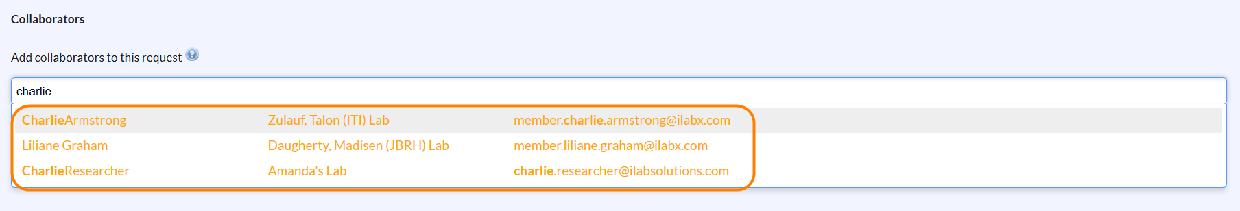 If the facility requires access requests, the user adding collaborators may encounter that the researcher they need to add shows up in an orange color on the results list. Results that are in orange indicate that the researcher has not been granted access to the core facility.