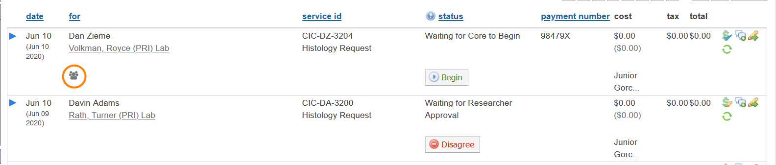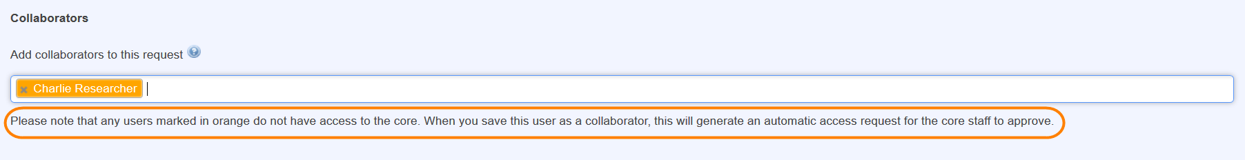 A user in orange can be added to the request or reservation but will not be able to view or edit it until they are granted access to the core facility. Once a user in orange is added to a request or reservation an access request will automatically be generated on their behalf.