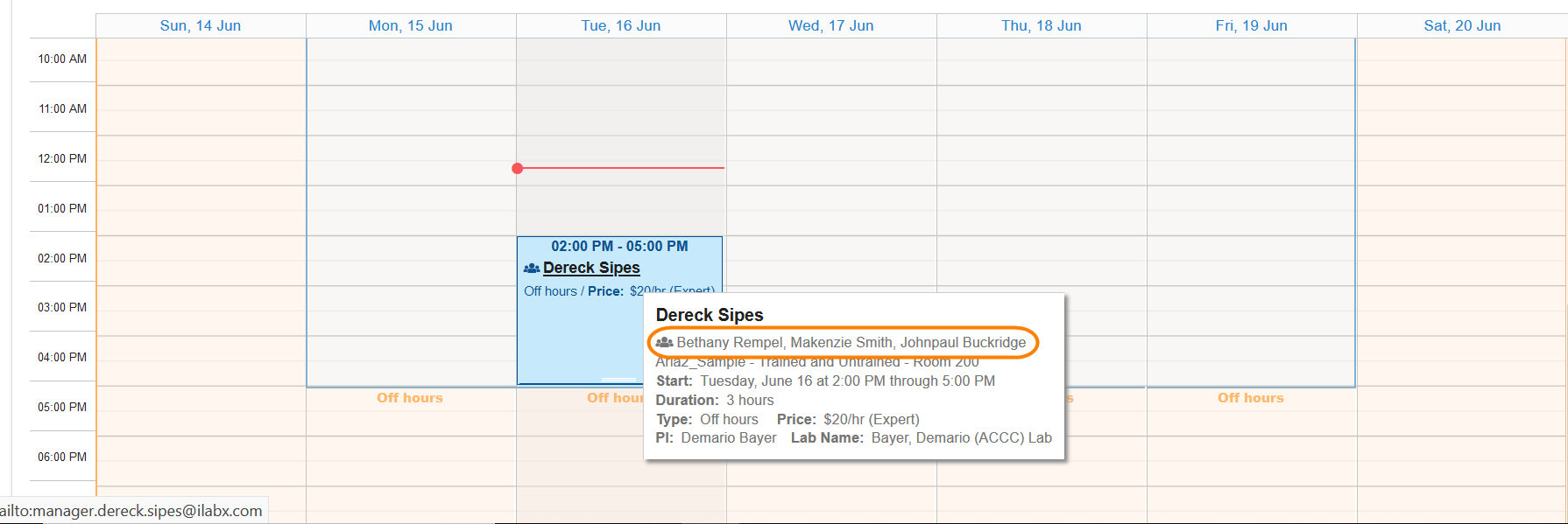 If you hover over the reservation to view the details the names of the collaborators will be included in the details. The collaborators will also be shown when the reservation details are open by clicking on the reservation.
