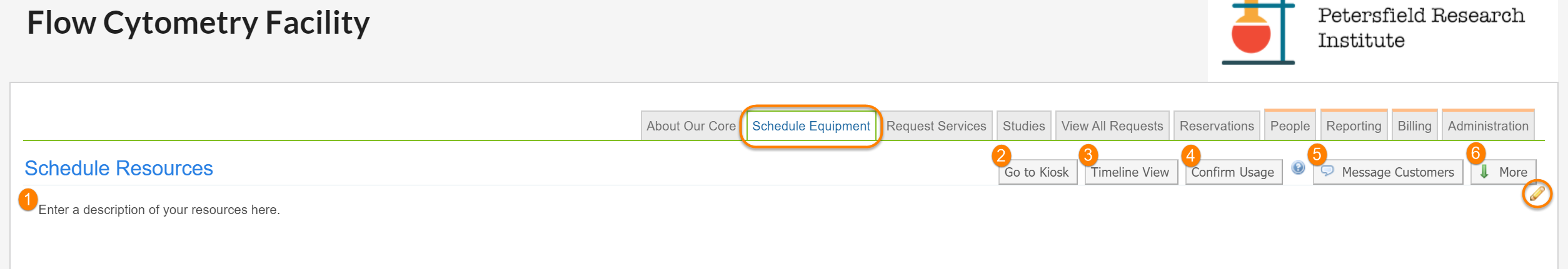 As a core administrator, the Schedule Equipment tab is used to create reservations, perform usage uploads, view and confirm usage, and edit calendar settings for core equipment. This page can also be accessed by core customers to create reservation(s) on equipment (see Schedule Equipment), though various functions and options used by administrators will not be available to customers. If scheduling has been enabled within your core, the Schedule Equipment tab will be displayed after accessing the core. The Schedule Equipment tab is accessed from your core's homepage. Because this tab can be renamed in the administrative Scheduling settings, it may be labeled differently within your core.