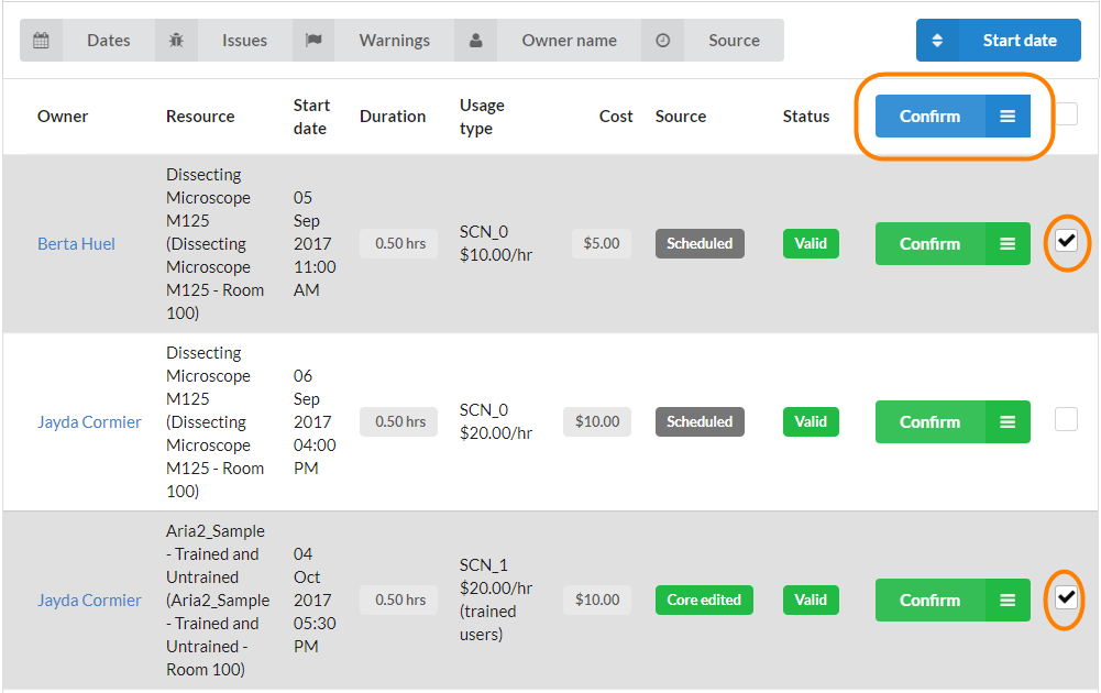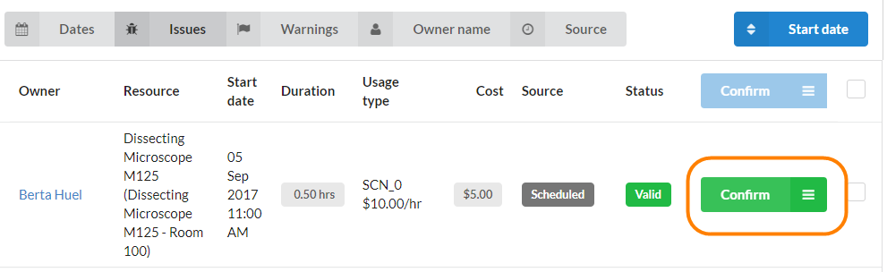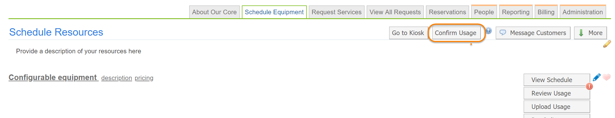 To confirm usage across multiple calendars and users from one interface, click on the "Confirm Usage" button on the core’s Schedule Equipment tab.