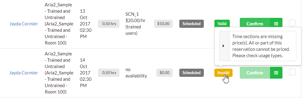 Invalid records will display in yellow. When an invalid record is identified, hover over the "Invalid" button to display suggestions on how to edit the reservation so it can be confirmed.