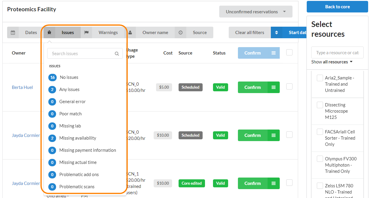 - Table filters and sort: The filter and sort options across the top of the page allow you to filter reservations by date, issues, warnings, reservation owner, and source. Select a filter and click apply to see an updated reservation list. To clear the filter, click the 'clear filter' button.
