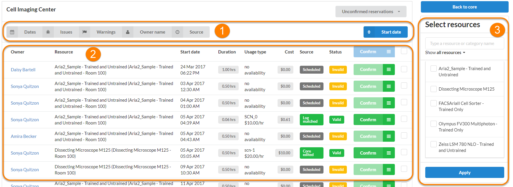 - Resources (equipment) list panel: The 'Select resources' panel to the right of the page will display all calendars available at the core. Use the select resources panel to filter for specific resource reservations. Select a resource and click 'Apply'. Your filtered list will display.