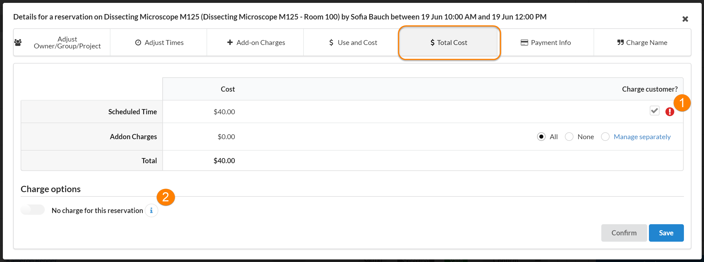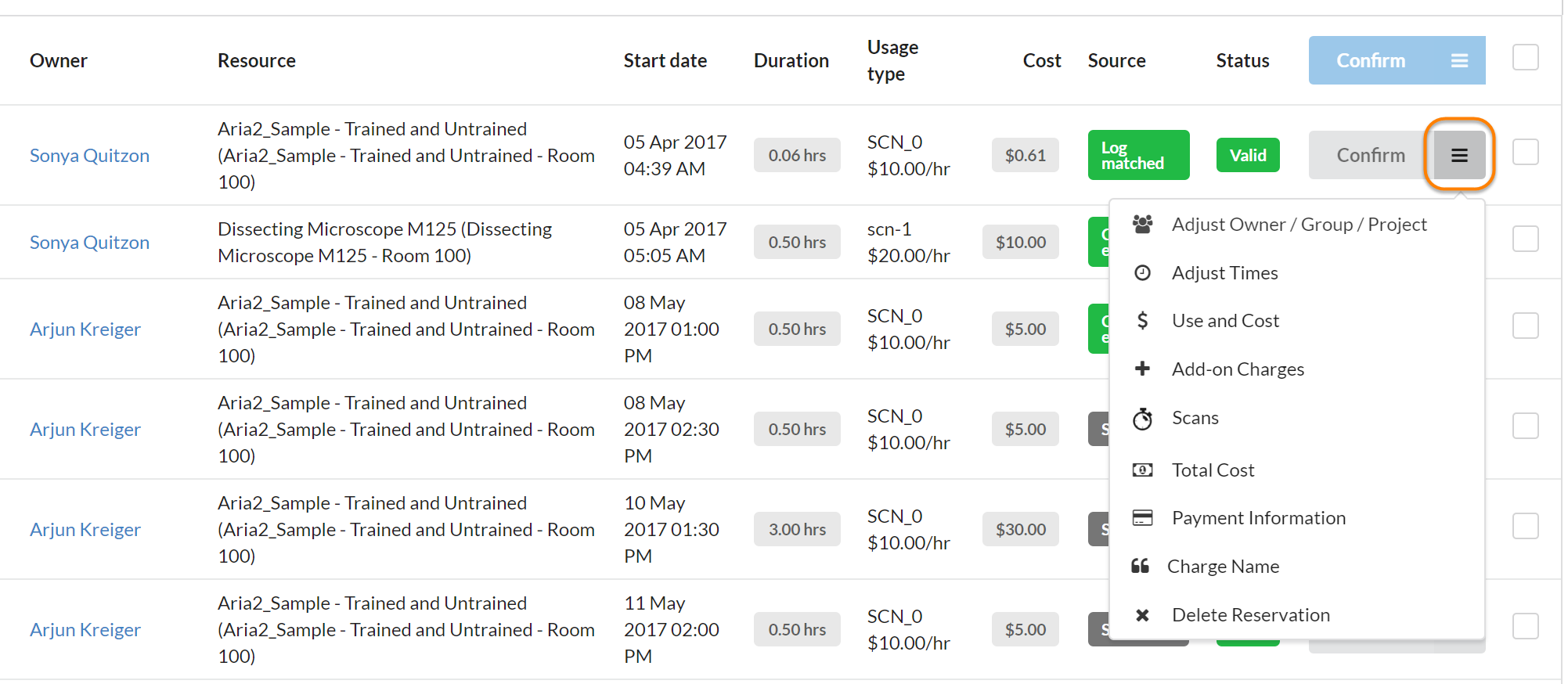 Confirming usage on calendars provides core administrators the opportunity to review and prepare each reservation for billing by confirming the charges associated with the reservation. Confirming usage on resources is the responsibility of core administrators and can be found on the Schedule Equipment tab.