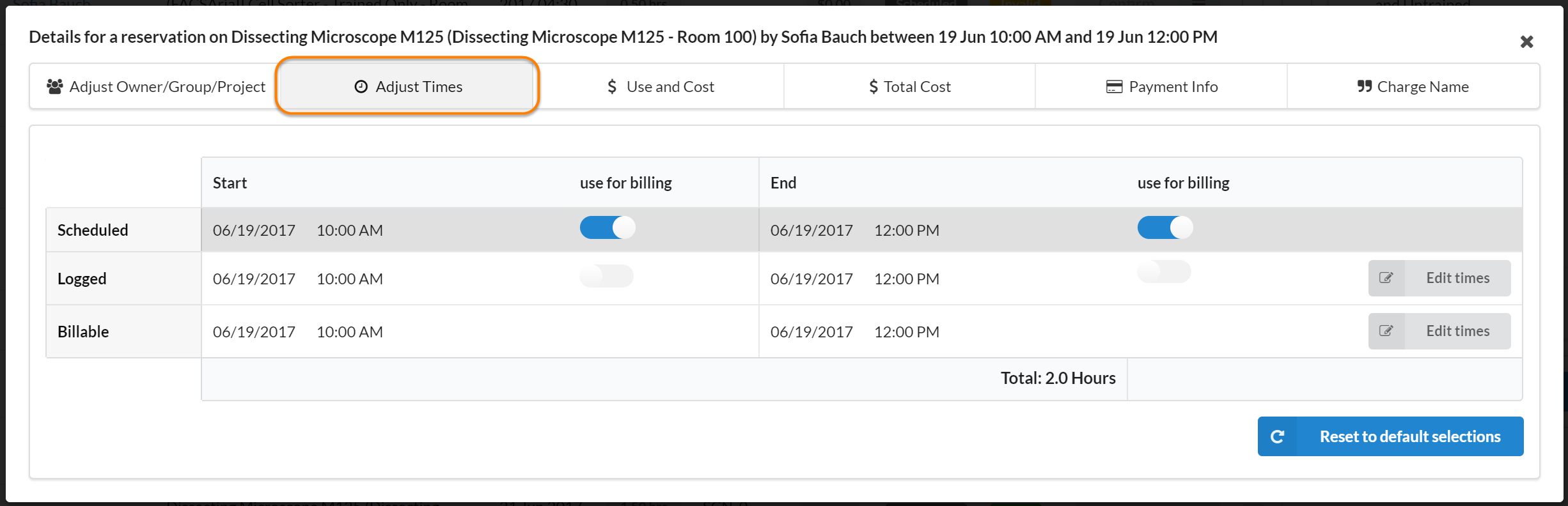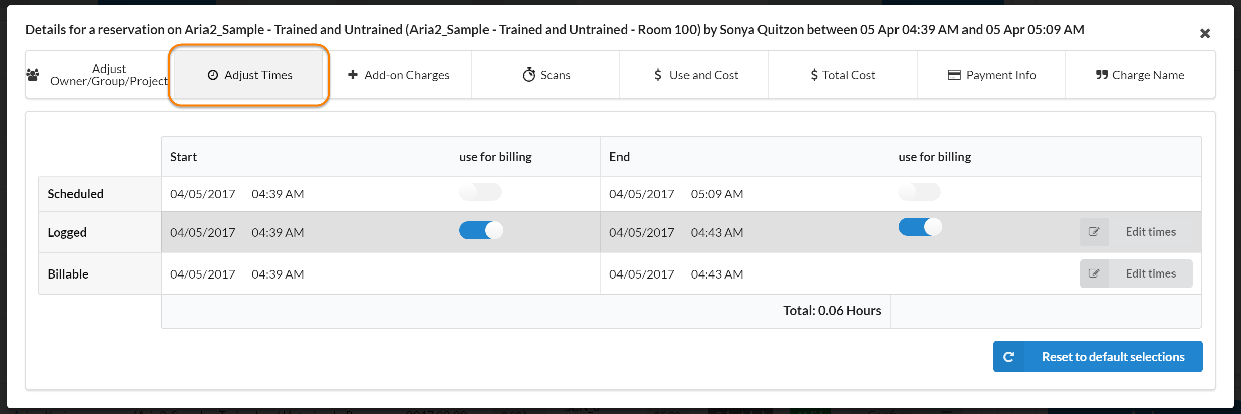- Adjust Times allows for you to adjust the scheduled, logged, or billable time of the reservation.