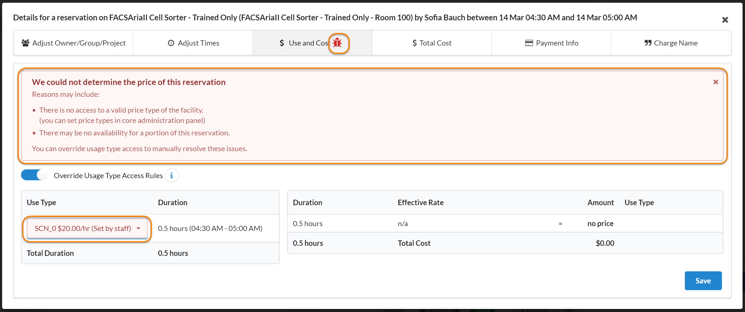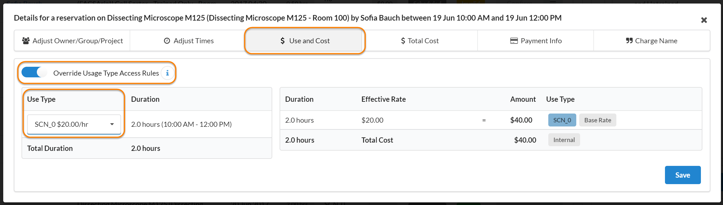 - Use and Cost allows you to view the usage type and price associated with that usage. If the usage type is incorrect, you can override the usage type and pick the correct availability for the reservation by toggling the blue Override Usage Type Access Rules button and selecting the new usage type.