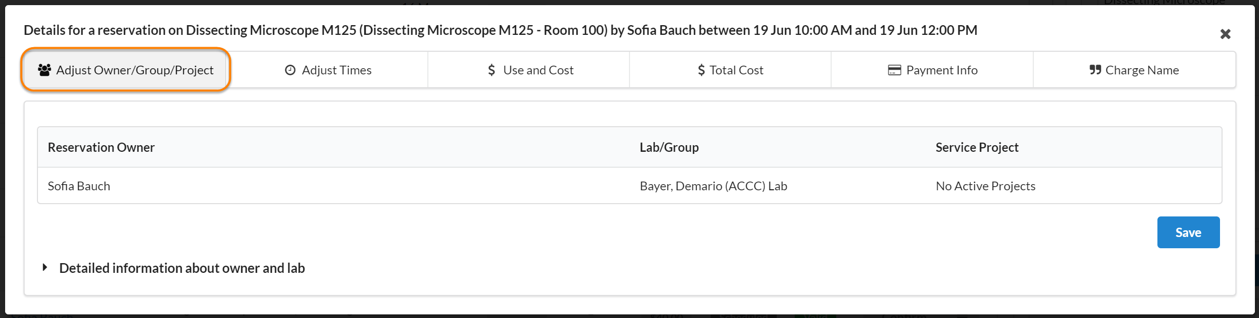 - Adjust Owner/Group/Project allows you to view the reservation owner, their lab, lab contacts or assign this reservation to a processing service request.
