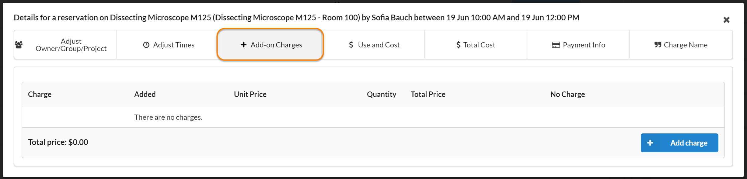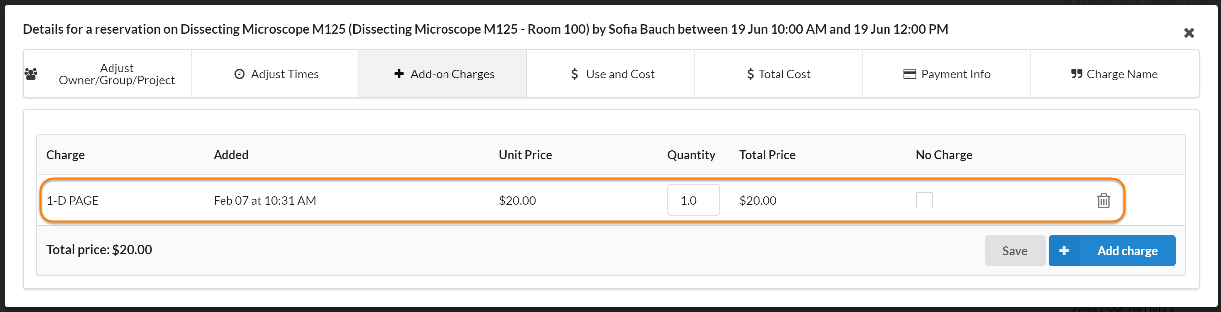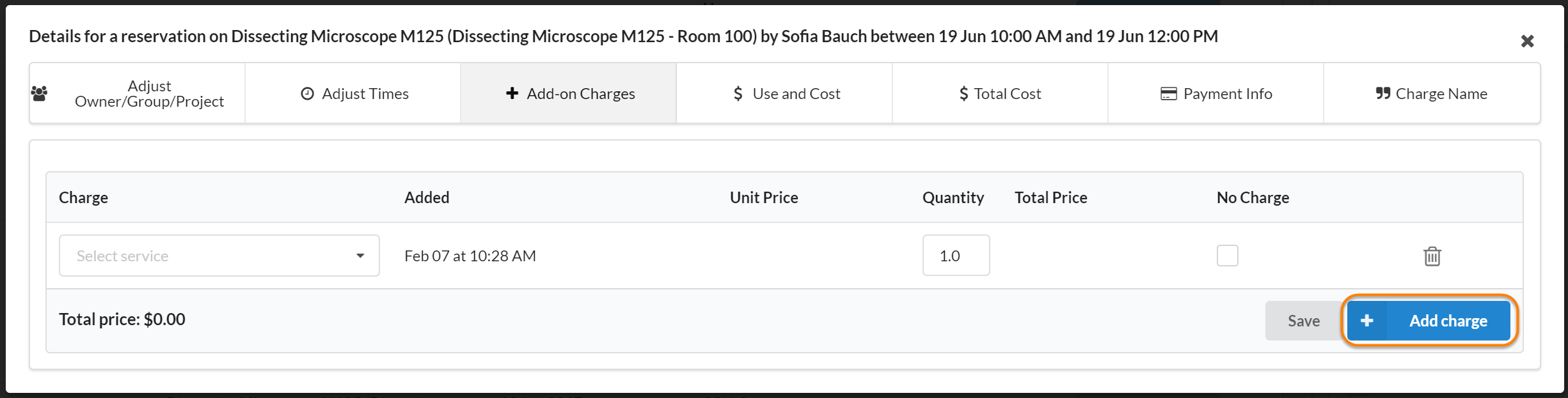 To add a charge, click the "Add charge" button. Select the charge you would like to add from the Select service drop down on the left hand side. Update the quantity and click save.