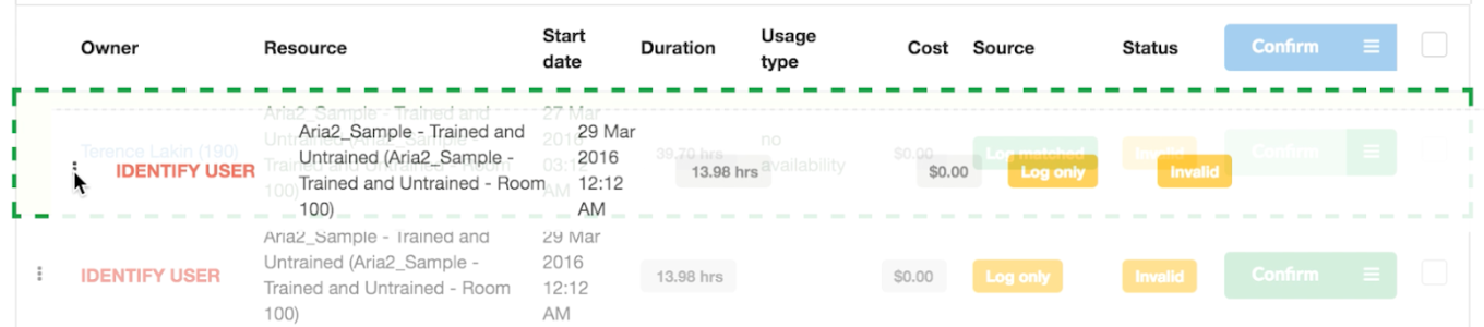 Records that can be merged will display a “handle” (i.e., three vertically aligned dots) on the very left of the row on hover. Click the row and hold down the cursor. Then drag the record up or down to match the usage records.