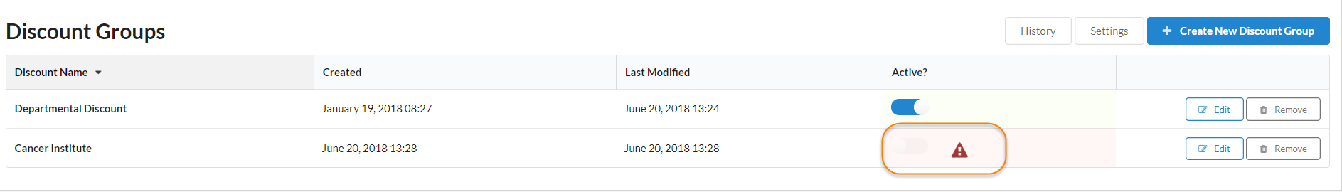 Once you create your new discount group, make sure you define it as "Active" by clicking the toggle under "Active?" so that it displays blue. A warning icon (red triangle) will indicate any issues, as displayed below. You will not be allowed to activate the discount group until you fix the issues.