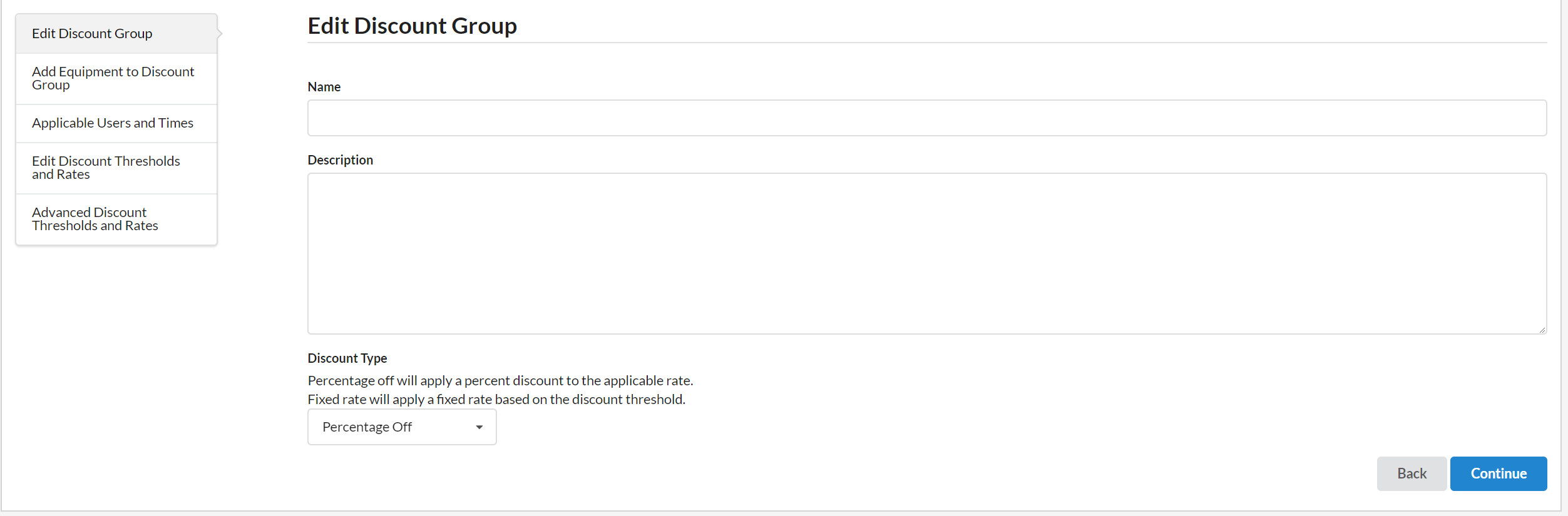 Edit Discount Group allows you to provide a name (mandatory) and description (optional) of the discount.