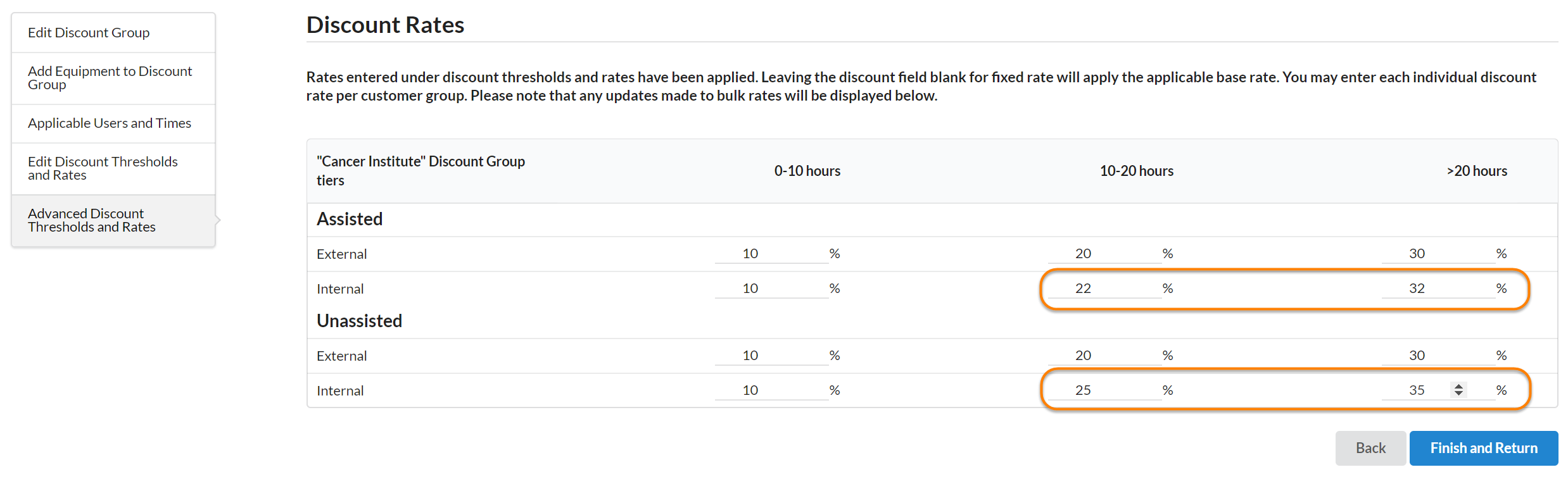 In the example above the Internal price type is receiving more of a discount for the Assisted and Unassisted usage types for hours above 10 hours. Once you have completed the set up click Finish and Return to be directed back to the Discount Groups page where you can make your newly created discount active.