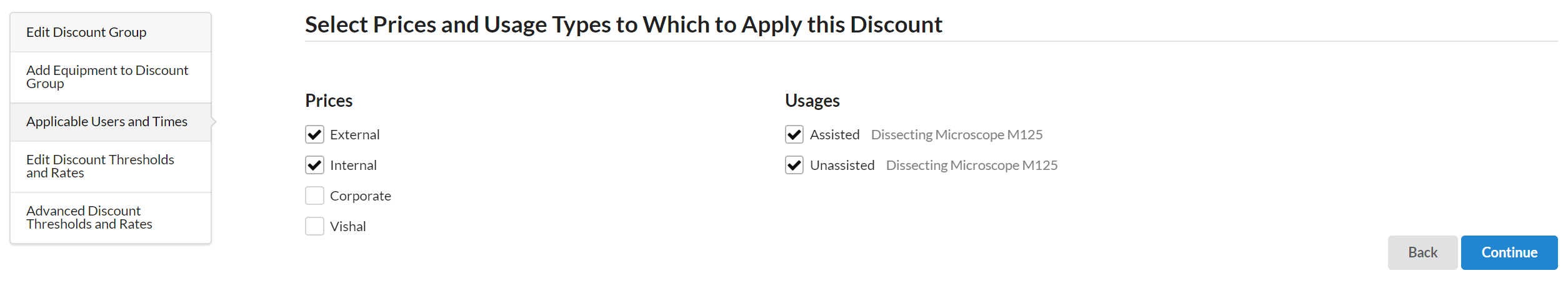In the Applicable Users and Times section, you can select what price classes to receive certain discounts and exclude others. You can also select the usages that qualify for the discount. Only reservations meeting the selected criteria will count towards reaching the discount threshold.