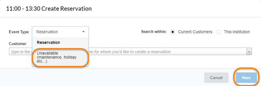 From the event type drop-down list, select ‘Unavailable (maintenance, holiday, etc.)’, and press 'Next':