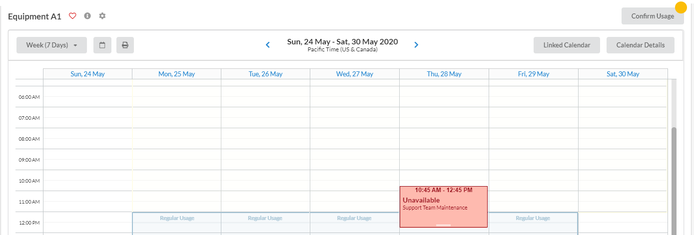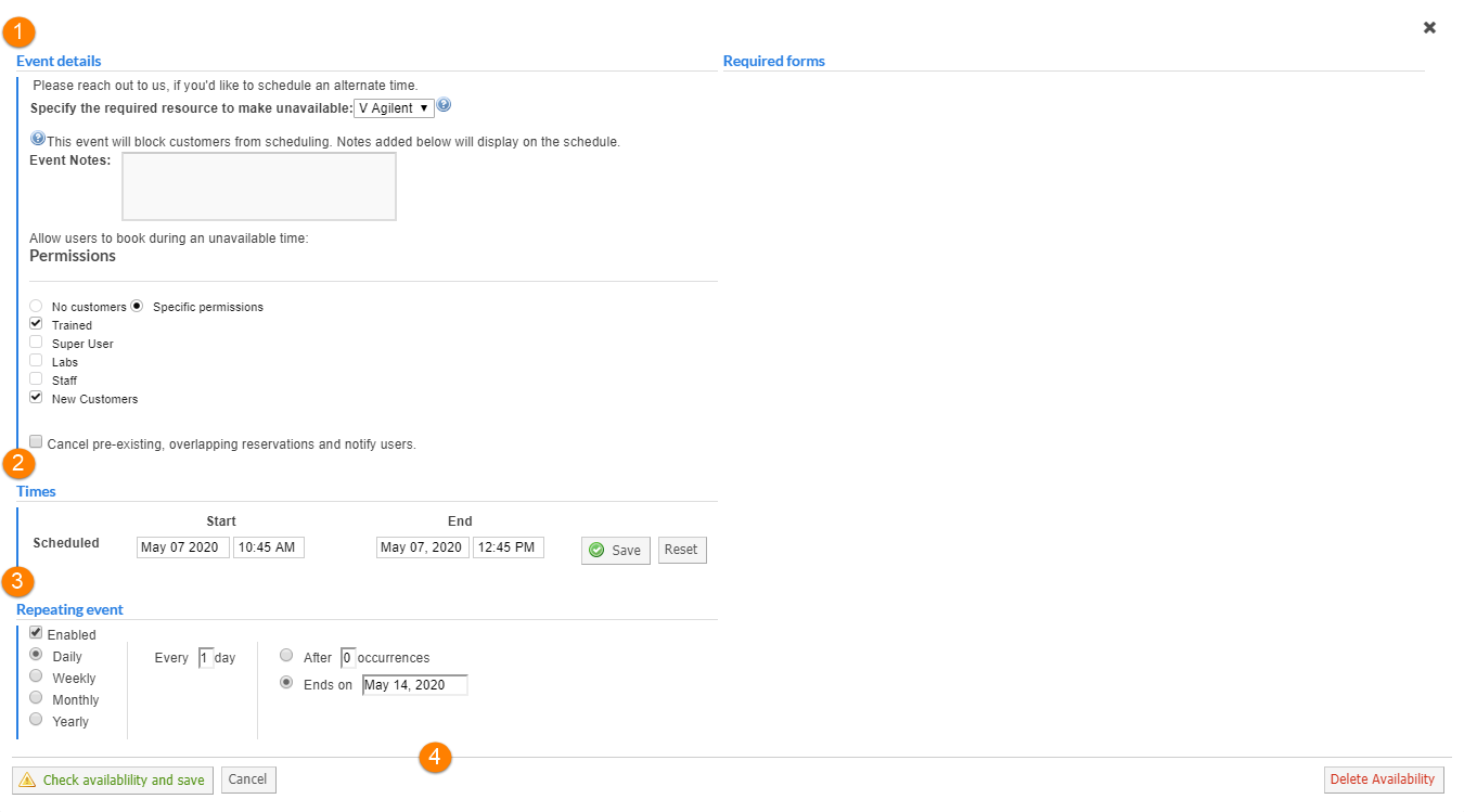 - Event Details: Add ‘Event Notes’ to be displayed on the calendar view (e.g., reasons for the unavailability, inquiries or other relevant information) and choose if any specific group can have access to the equipment during the unavailability. You can also cancel any pre-existing, overlapping reservations and notify users about the cancelation.