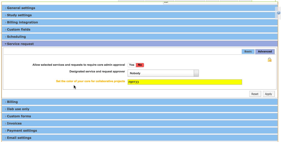 You should also make sure that your core is assigned a unique color. This is an advanced setting under the Service Requests Settings of “Other Settings” and requires an iLab employee to set for you. Each core collaborating with one another should have a different color designation.